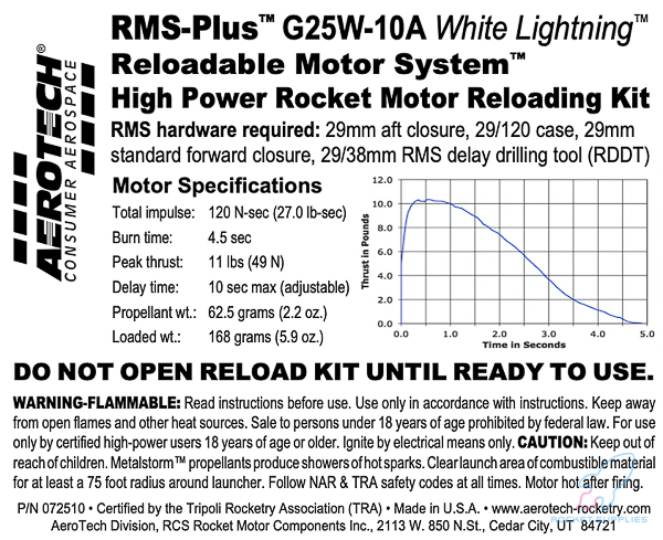 The AeroTech motor reload kit comes with 1 rocket motor reload. Reload kits include all internal motor components and FirstFire™ Initiators. Requires HAZMAT shipping via UPS or FEDEX. The sale of this high power motor to persons under 18 years of age is currently prohibited by federal law. Orders containing this item will not be shipped until proof of age (such as a copy of a driver’s license) is received.
