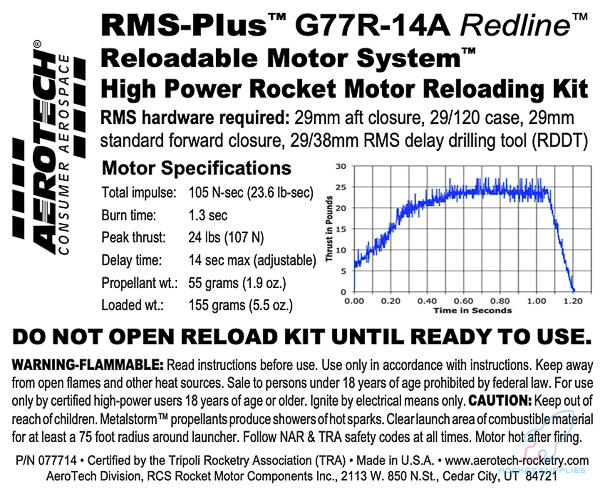 The AeroTech motor reload kit comes with 1 rocket motor reload. Reload kits include all internal motor components and FirstFire™ Initiators. This AeroTech motor is U.S. mailable with no hazmat fee! The sale of this high power motor to persons under 18 years of age is currently prohibited by federal law. Orders containing this item will not be shipped until proof of age (such as a copy of a driver’s license) is received.