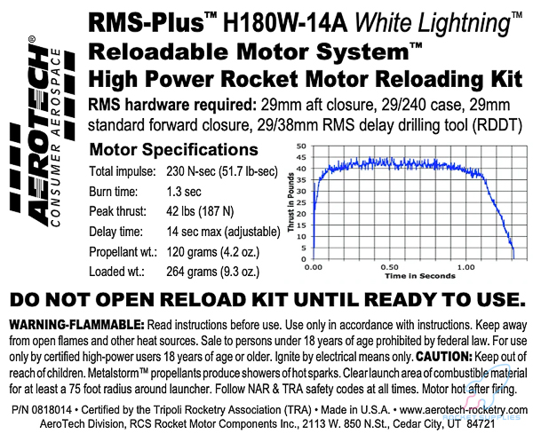 The AeroTech motor reload kit comes with 1 rocket motor reload. Reload kits include all internal motor components and FirstFire™ Initiators. This AeroTech motor is U.S. mailable with no hazmat fee! The sale of this high power motor to persons under 18 years of age is currently prohibited by federal law. This is a High-Power motor requiring Level 1 High-Power certification through NAR or Tripoli to purchase. Orders containing this item will not be shipped until proof of age (such as a copy of a driver’s license) and proof of Level 1 certification is received.