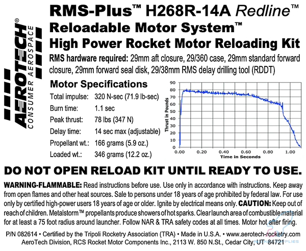 The AeroTech motor reload kit comes with 1 rocket motor reload. Reload kits include all internal motor components and FirstFire™ Initiators. This AeroTech motor is U.S. mailable with no hazmat fee! The sale of this high power motor to persons under 18 years of age is currently prohibited by federal law. This is a High-Power motor requiring Level 1 High-Power certification through NAR or Tripoli to purchase. Orders containing this item will not be shipped until proof of age (such as a copy of a driver’s license) and proof of Level 1 certification is received.