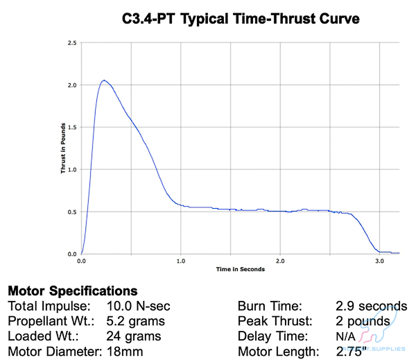 The C3.4T-P is a Plugged motor reload. Plugged reload kits do not utilize a motor-actuated delay or ejection charge. Plugged motors must be used in conjunction with a timer, altimeter or radio-activated recovery system. This motor was designed for R/C rocket gliders.