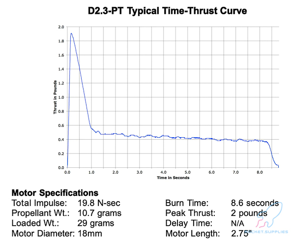 The D2.3T-P is a Plugged motor reload. Plugged reload kits do not utilize a motor-actuated delay or ejection charge. Plugged motors must be used in conjunction with a timer, altimeter or radio-activated recovery system. This motor was designed for R/C rocket gliders.