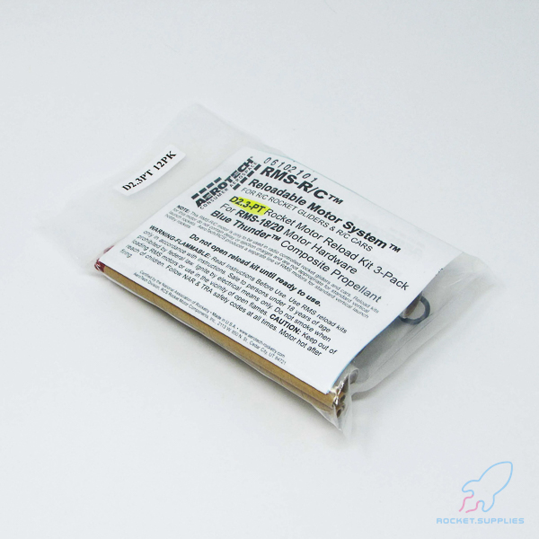 The AeroTech Reloadable Motor System RMS is an aluminum cased reusable motor in kit form that is assembled by the user. You will need AeroTech RMS-18/20 motor hardware to build and complete the motor for many reliable flights. Motor hardware is available separately in a complete set, and also as individual parts. Important: Mid Power RMS reload kits are not compatible with High Power RMS products. This RMS motor reload utilizes RCSs exclusive Blue Thunder™ aerospace grade composite propellant formulation, which produces a gorgeous bright violet-blue flame with a minimum of exhaust smoke. Blue Thunder™ motors provide a higher level of thrust than White Lightning™ motors of the same total impulse and are perfect for high lift-off acceleration.