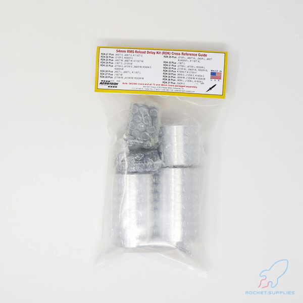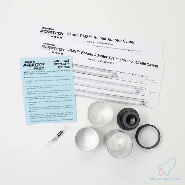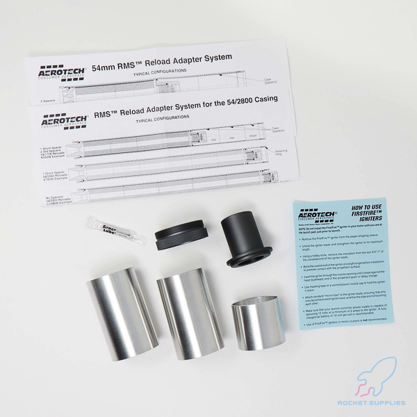 For use with all AeroTech RMS-54 high power motor reload kits. Includes two 54mm standard case spacers, one 54mm short case spacer, one 54mm floating forward closure, one 54mm forward closure retaining ring. Motor reloads sold separately. Important: High Power RMS reload kits are not compatible with Mid Power RMS products.