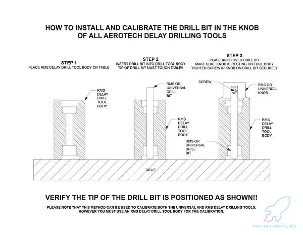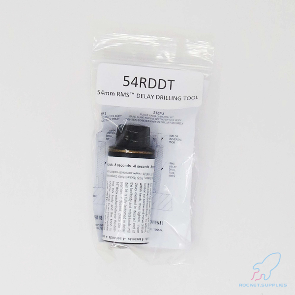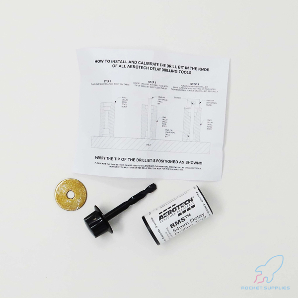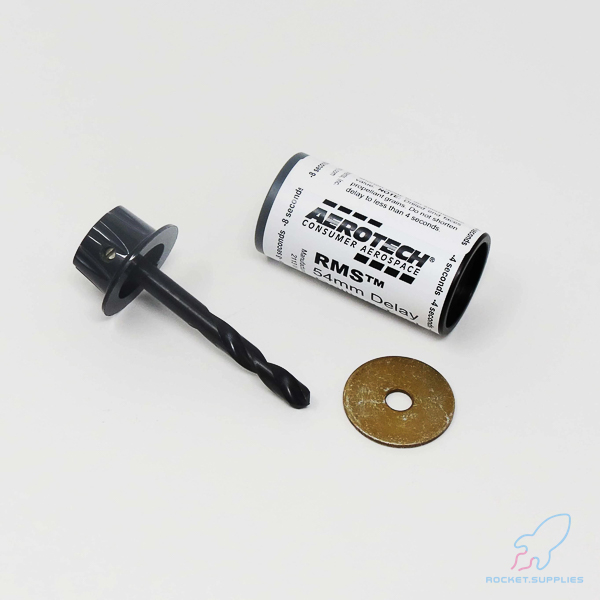 The 54mm RMS Delay Drilling Tool™ (or 54RDDT, P/N T082510-2) is designed for shortening RMS delay elements to adjust the time delay of a 54mm AeroTech RMS reloadable motor. The 54RDDT consists of a machined drill tool body and a 1/4” stub drill bit with an attached knob. The tool also has a provision for calibration, as the tip of the drill bit must be flush with the end of the tool body for accurate use. Though adjusted initially at the factory, a set screw placed within the knob makes any necessary readjustment easy.The ends of the tool are counterbored with recesses that are labeled with 4 or 8 second reductions in the delay time. To use, the RMS or RMS-Plus delay element is placed into the desired end of the tool and held firmly in place, the drill bit is inserted and the knob is rotated clockwise until the bit is fully seated in the delay and no resistance is felt. In addition, a supplied 1/16” thick washer may be placed between the drill tool body and the drill knob to shorten the delay to an intermediate value.As is always the case with drilled RMS delays, the delay element should be installed in the motor with the drilled end facing the propellant grains (or away from the ejection charge) for best delay accuracy. Also, no delay should be shortened to less than 4 seconds.AeroTech is planning to eventually sell most RMS reloads in only the longest certified delay, so the RMS Delay Drilling Tool will be essential for the future use of the RMS line of products.