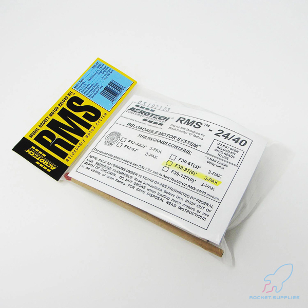 The AeroTech Reloadable Motor System RMS is an aluminum cased reusable motor in kit form that is assembled by the user. You will need AeroTech RMS-24/40 motor hardware to build and complete the motor for many reliable flights. Motor hardware is available separately in a complete set, and also as individual parts. Important: Mid Power RMS reload kits are not compatible with High Power RMS products. This RMS motor reload utilizes RCSs exclusive Blue Thunder™ aerospace grade composite propellant formulation, which produces a gorgeous bright violet-blue flame with a minimum of exhaust smoke. Blue Thunder™ motors provide a higher level of thrust than White Lightning™ motors of the same total impulse and are perfect for high lift-off acceleration.