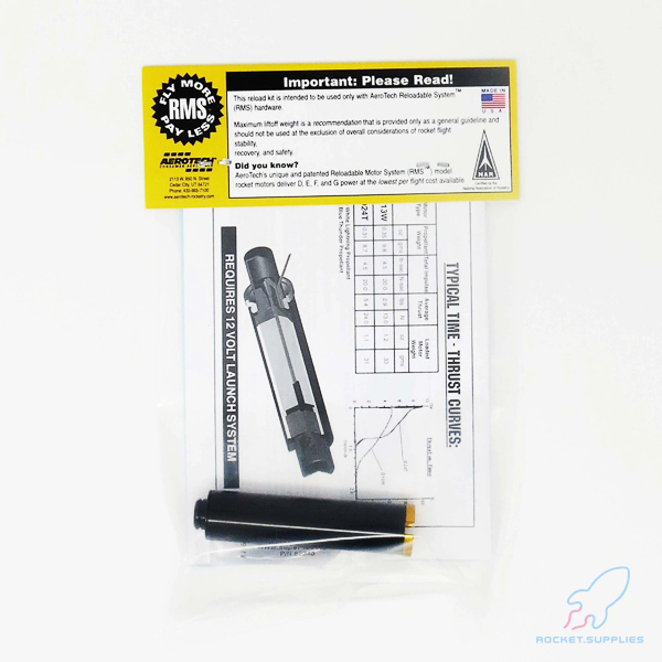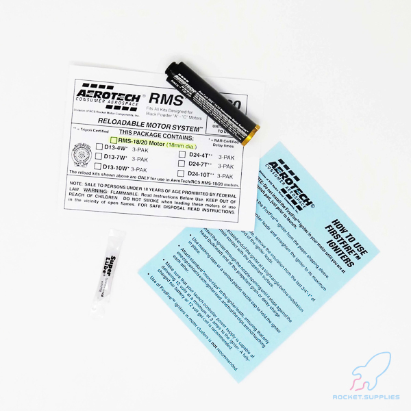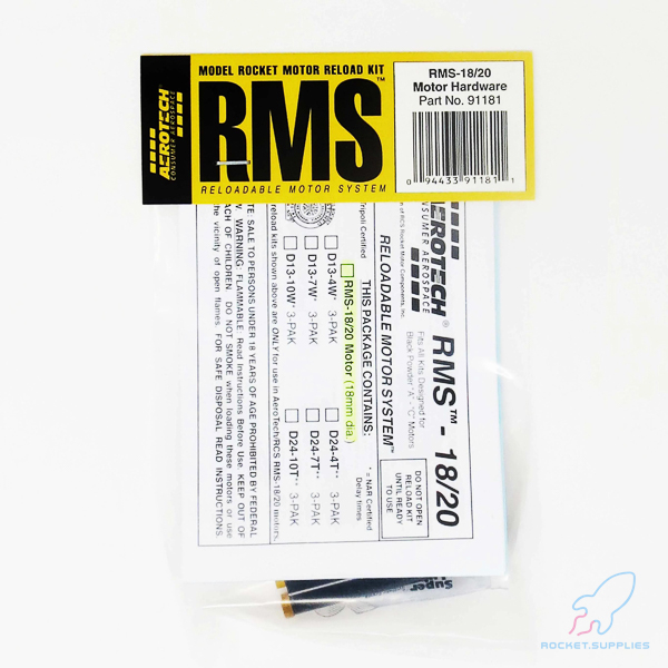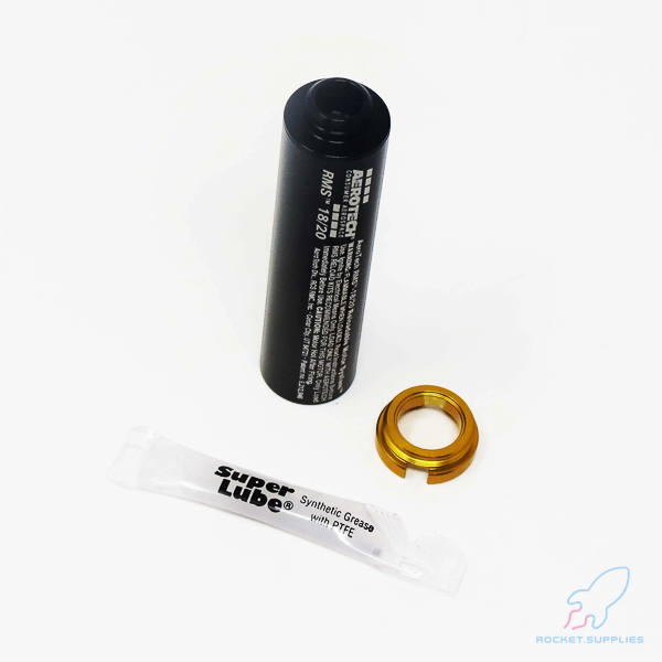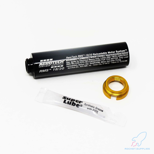 For use with all AeroTech RMS-18/20 motor reload kits. This reusable AeroTech RMS-18/20 motor hardware set includes the aluminum motor case, aluminum motor forward closure, aluminum motor aft closure, and a 1cc tube of the Super-Lube grease for assembly. Motor reloads sold separately. Important: Mid Power RMS reload kits are not compatible with High Power RMS products.