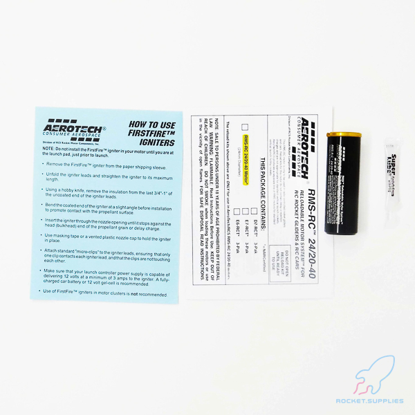 For use with all AeroTech RMS-R/C-24/20-40 motor reload kits. This reusable AeroTech RMS-R/C-24/20-40 motor hardware set includes the aluminum motor case, permanently plugged forward closure, aluminum motor aft closure, and a 1cc tube of the Super-Lube grease for assembly. Motor reloads sold separately. Important: Mid Power RMS reload kits are not compatible with High Power RMS products.