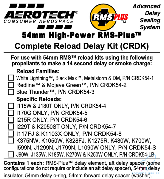 The AeroTech RMS-Plus™ CRDK54-08 is for use with RMS-54 I117FJ Black Max™ and K1103X Propellant X™ reload motors using the 14 second adjustable delay. The motor complete reload delay kit comes with 1 rocket motor delay element, and insulators and spacers (if needed). Other motor delay parts are supplied with the RMS reload kits. Important: High Power RMS reload delay kits are not compatible with Mid Power RMS products.