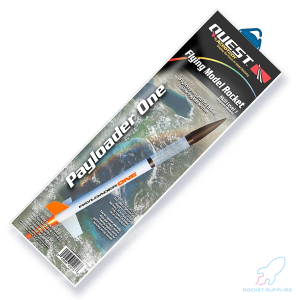 The Quest Payloader One model rocket kit is one of three Quest model rockets to use TTW Through-The-Wall balsa fin attachment. There are three precise pre-cut slots in the body tube that allow for perfect placement and location of the fins. Also features a semi-transparent payload compartment and parachute recovery system. The Payloader ONE model rocket mixes challenge and high performance.