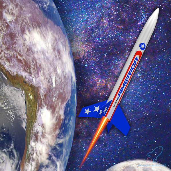 Show your patriotism and fly the America. Balsa fins and a molded plastic cone make this a good Skill Level One build with parachute recovery.
