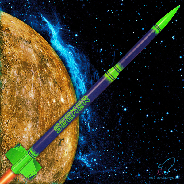 The Seeker model rocket is quick off the pad and even quicker to build. The Seeker model rocket is a great choice when building time is limited. With pre-finished colored body tubes and a full self-adhesive decal set the Seeker model rocket goes from 'kit to pad' faster than you can say “wow!” Includes a large payload section too.