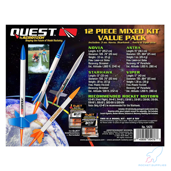 Novia, Astra, and Viper uses Quest Q-Jet™ A3-4 (1st flight), B4-4, C12-6, D16-6, D16-8 composite propellant rocket motors. Starhawk uses Quest Q-Jet™ A3-4 composite propellant rocket motors only! Other brands of model rocket motors, with a similar motor type (power) designation, should be OK for use in this product.