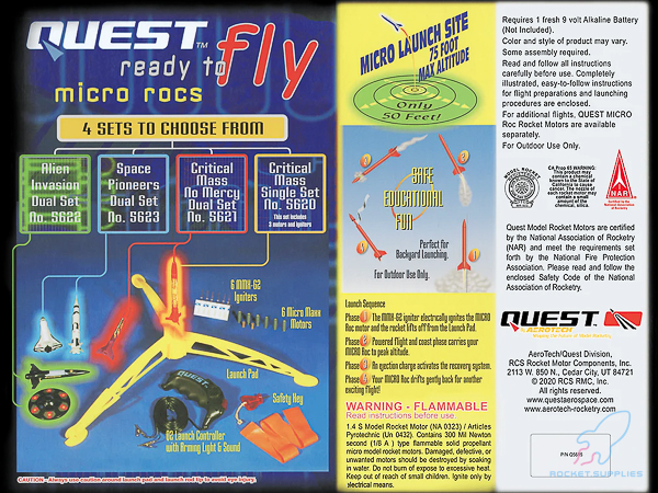 Quest’s RTF Micro Maxx™ Starter Set delivers the thrilling experience of model rocketry in a small yard setting! These Ready-to-Fly micro-sized rockets require only a 50-foot diameter launch area. Designed for backyard fun - you won’t lose these micros the first time you launch them. Featuring the powerful Micro Maxx™ motor, maximum altitude is 120 feet and the silver Mylar™ streamer recovery system ensures that they land nearby! This starter set includes one RTF Critical Mass Micro Maxx™ Rocket with streamer recovery, 3 Micro Maxx™ rocket motors with MMX-G2 initiators, Launch Pad and Q2 Launch Controller, plus a collector style display stand. The only thing extra to buy is a 9-volt alkaline, snap-top, battery for the Launch Controller (sold separately).