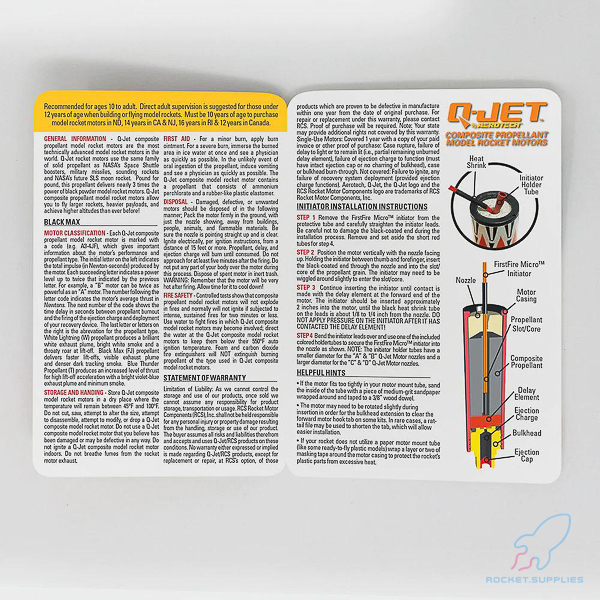 This Q-Jet™ 25-Motor Value Pack comes complete with 29 FirstFire™ Micro Initiators and bright orange Parachute Recovery Wadding. All Q-Jet™ motors are U.S. mailable with no hazmat fee!