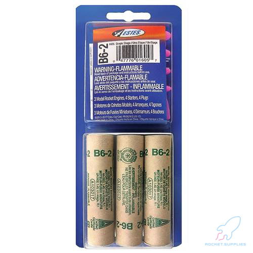 The Estes B6-2 engine is single stage engine designed for model rocket flight. This engine is a standard engine designed for flights in rockets weighing less than 4.5 ounces, including the engine. Each package includes 3 engines, 4 starters and 4 plugs.