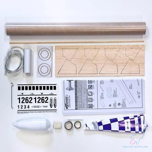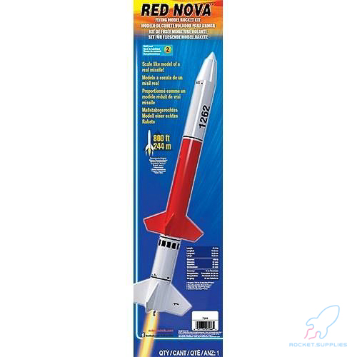 D engine powered and a great four fin design rocket! The Red Nova stands 21.6 inches tall and can reach an altitude of 800 feet. Once again, a well designed kit and comes with the standard high quality parts Estes is known for! Precision laser cut wood fins. High quality body tube. Plastic nose cone. Colorful pre-assembled parachute. Impressive waterslide decals.