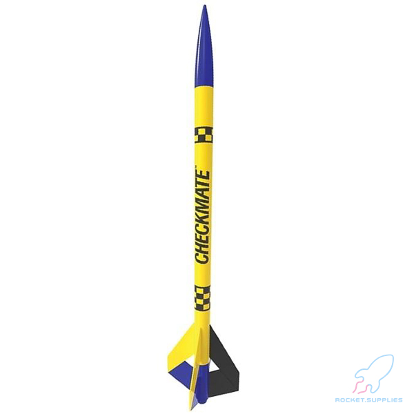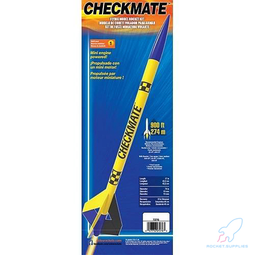 The Checkmate launches on mini engines (sold separately) and recovery is streamer for the rocket and tumble for the booster. Prepare for re-launch with a new Estes engine, wadding, a starter and starter plug.