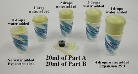 Above is a photograph showing the results of adding various amounts of water to the mixture of foam. The difference of just adding one drop of water is dramatic. Keep in mind that if you double the batch size, you will need to double the water amount to achieve the same expansion ratio. A little experimentation is highly recommended before actual use in your project.