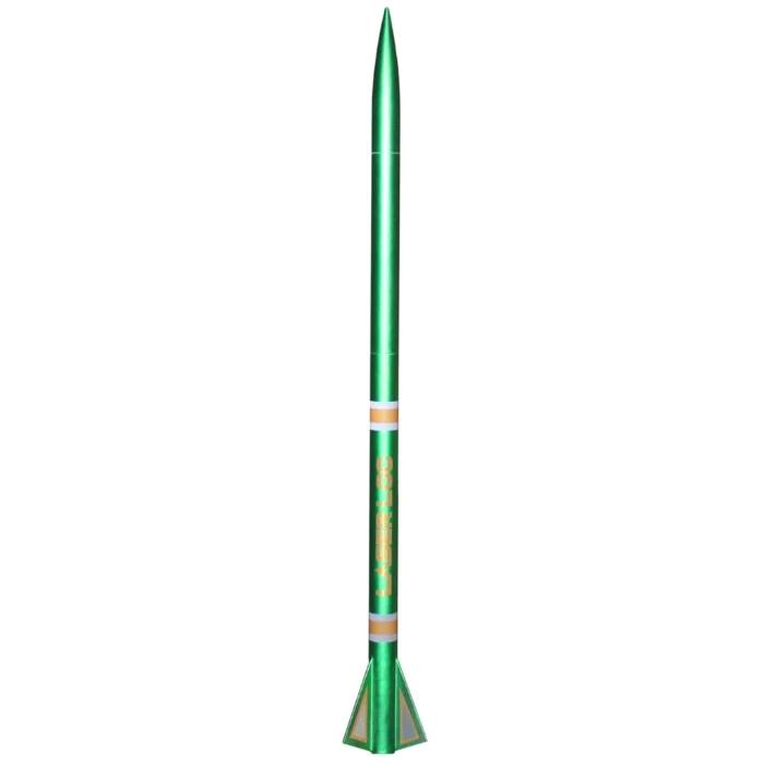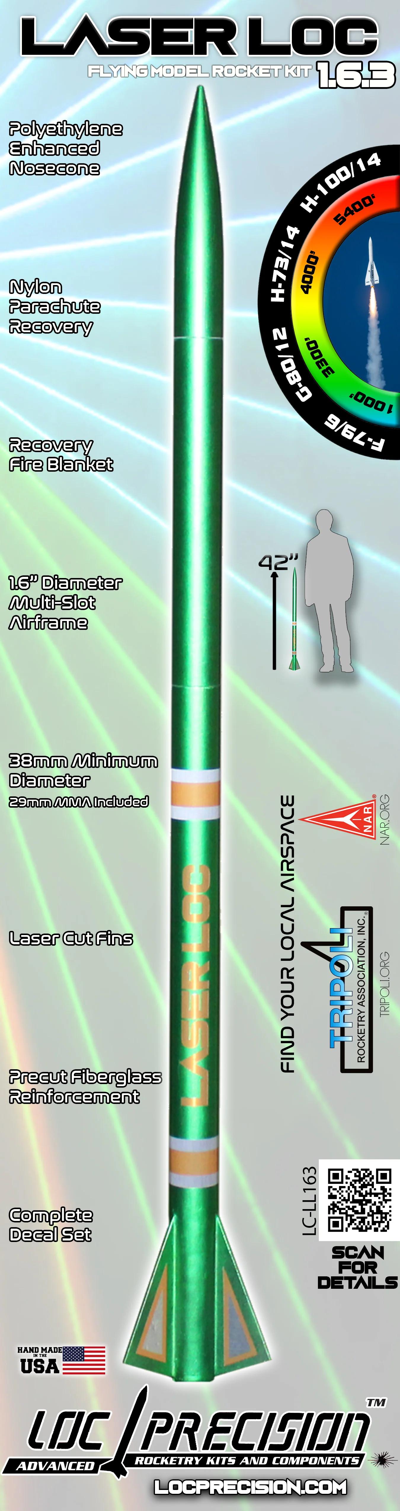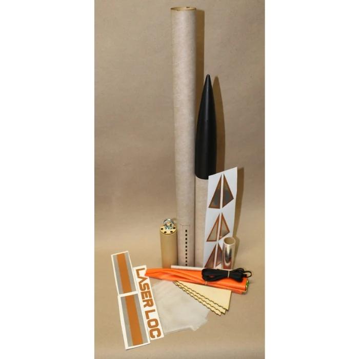 Celebrating 35 years of LOC - we bring back an old favorite! The LaserLOC series was one of the first production minimum diameter kits available to the public. Keeping the tradition going we have a few modern day tweaks that will put your skills to the test. A gentle laser etch around the slots allow for easier glassine removal. Multi-slot airframe allow the fins to click into the booster. Precut 4oz fiberglass cloth can be easily epoxied from fin-airframe-fin. This reinforcement will give your LaserLOC the strength for today's higher impulse motors. Fiberglass should be applied with a long cure epoxy for best results. If you have never glassed anything before, here's your chance! The booster is a zipperless design. 1/4" Launch lugs included. Fly away rail guides are another alternative.