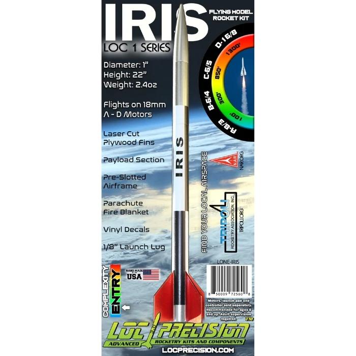 LOC-I series kits are perfect for your first flying model rocket kit! They were designed for fun and education in a classroom environment. With a pre-slotted airframe that's 2x the thickness of others, Kevlar shock cord and laser cut birch fins add to the durability and strength. An engine hook is included for 18mm motors ranging from A-D impulse. Decal, and nylon parachute!