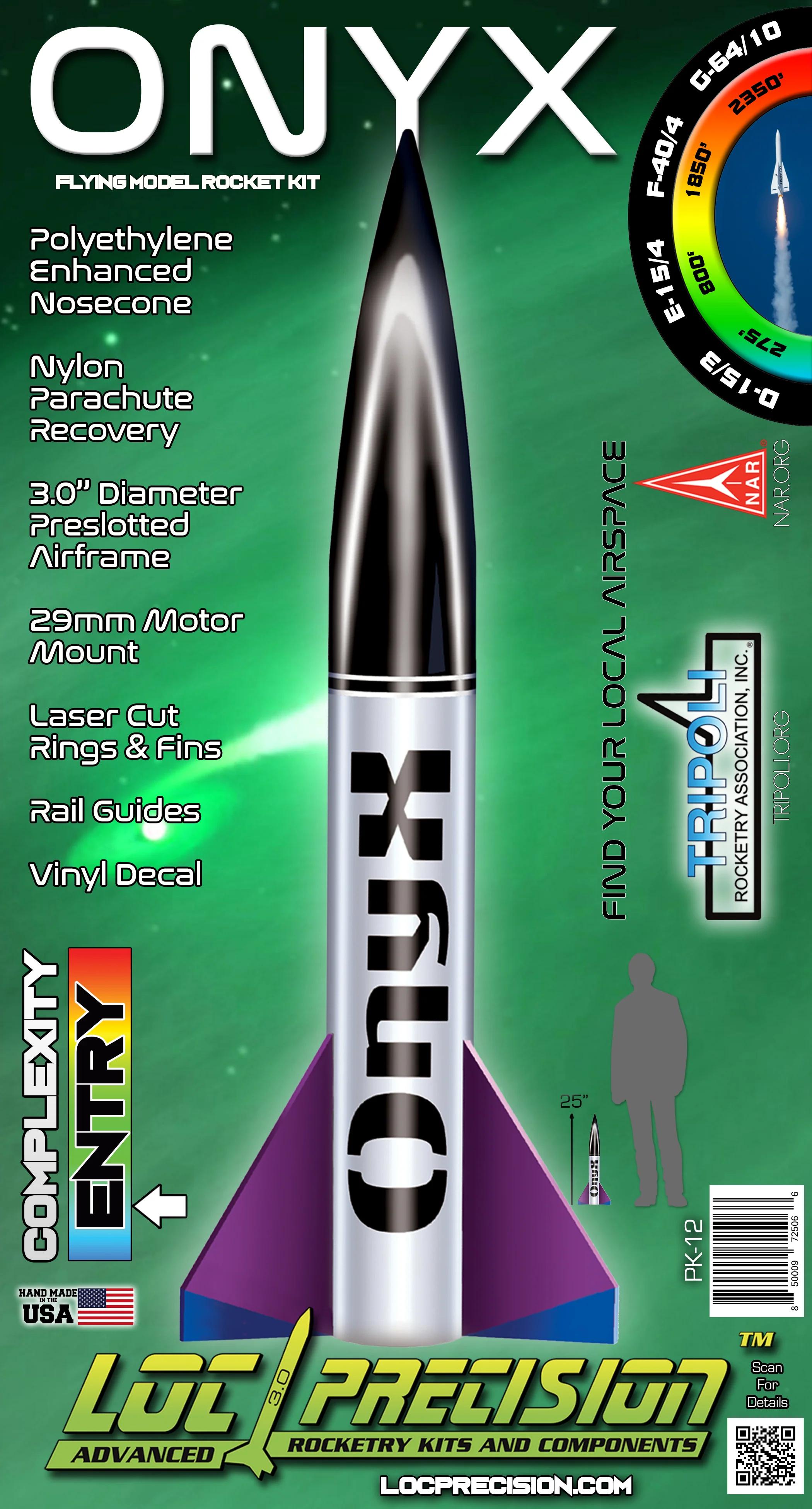 One of the original Novice Series kits, the Onyx rocket has a large diameter and stout appearance which makes this bird a natural for sport flying. NOW included slotted airframe! A single G motor can propel this vehicle to 1800 ft.