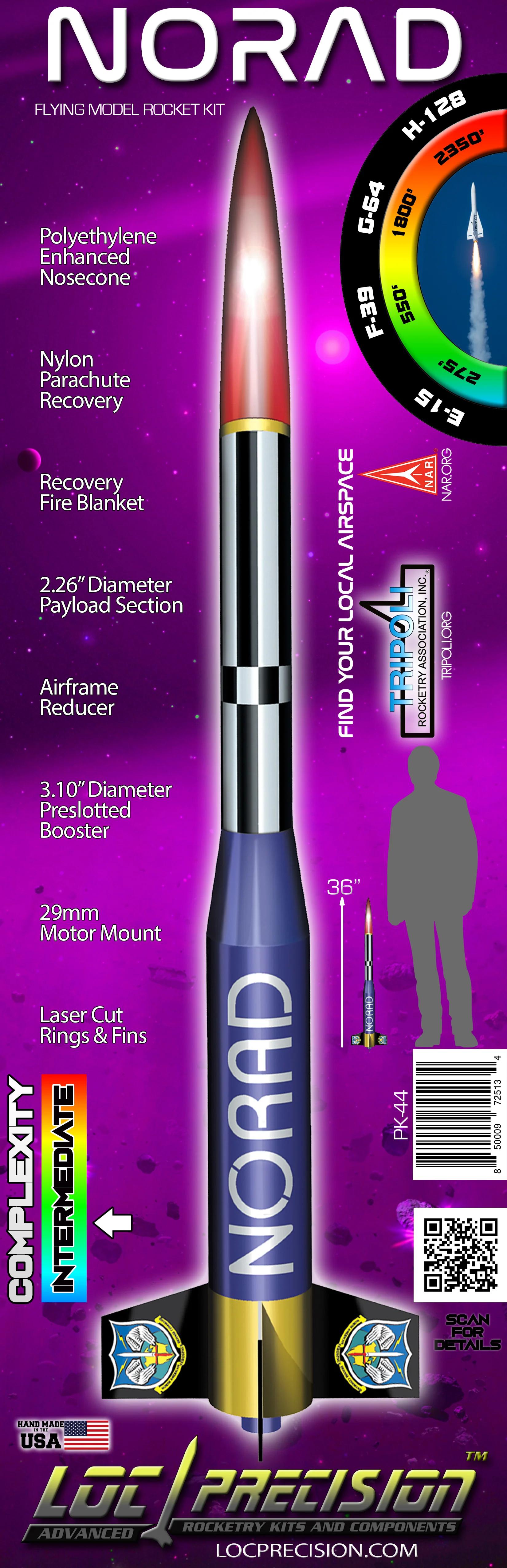 One of the ADVANCED SERIES of kits, which include factory pre-slotted airframe and through-the-wall fin construction, the NORAD is LOC's first concept of a tactical surface-to-air missile that performs beautifully on a variety of different F and G motors through Level 1 H motors. NORAD is a versatile kit that can really take the power - it is sure to be an attention getter at your next launch Parachute Recovery.