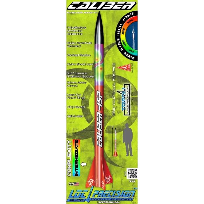 The Caliber ISP is one of the ISP PERFORMANCE SERIES of kits, which feature factory pre-slotted airframe and through-the-wall fin construction and high power motor capabilities, the CALIBER ISP is a light weight, high power performer. The 54mm motor mount is great for Level 1 motors. An Aerotech J-90 motor puts this kit out of sight - try one out if your field can handle it. It is a very cool flight! (and sometimes a long walk) This at-home rocket kit flies great on a variety of G, H and I motors using the optional MMA-3 (for 29mm motors) or MMA-4 (for 38mm motors) motor mount adapter. Includes baffle system.