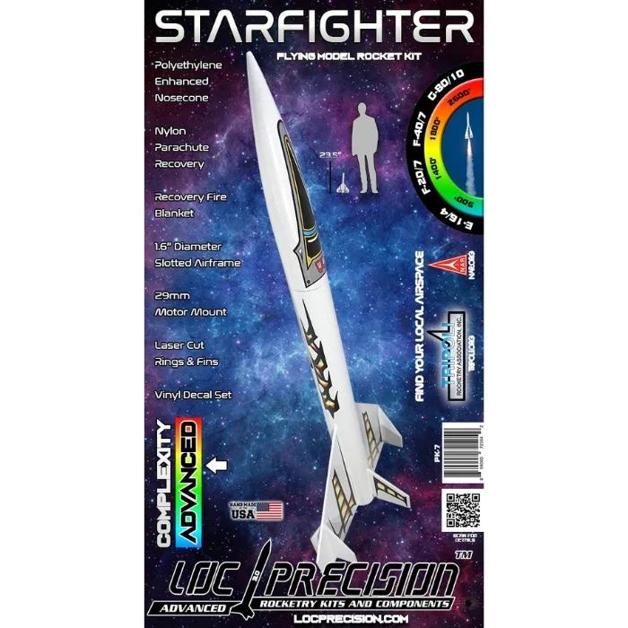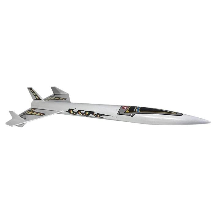 Full decal set now included! The STAR FIGHTER is an EXPLORER SERIES kit. A unique "Airplane" style rocket design that flies best on Aerotech E and G motors. Typical flight pattern is straight up with a half twist into the wind and glide to parachute deployment near apogee. New stabilizer construction is one piece with slide fit into a slot on the fin for easier alignment and gluing. The launch lug is covered by a shroud to complete the illusion of the intake duct. Parachute Recovery. Rail guides also included.