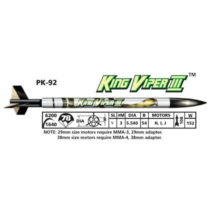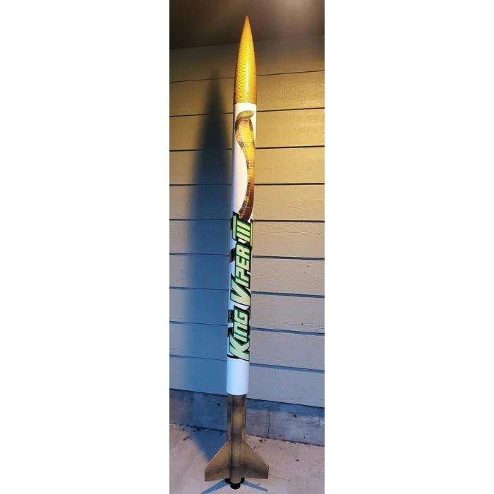The KING VIPER III is a unique 3 x 54mm motor cluster whose fins attach into the valleys of the motor mount tube cluster which extends beyond the main airframe. It can attain altitudes over 6800' using I motors and can fly nicely on 3 H180s as well using MMA-3 adapters. Don't let the picture fool you - this is one TALL rocket! For serious cluster flyers only! Includes EB-5.38 electronics bay.