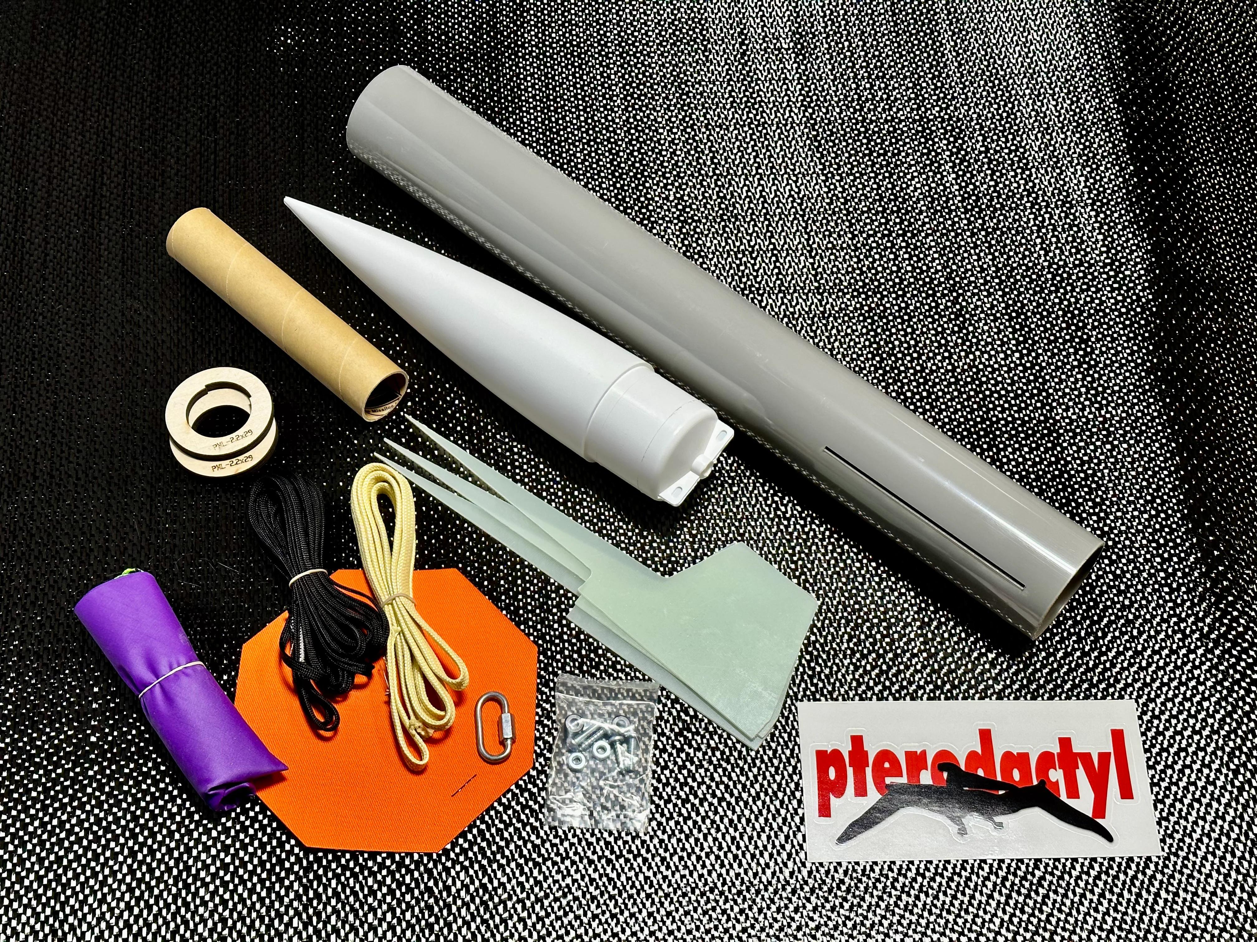 • Pre-slotted Quantum Tube airframe• 21" nylon parachute• Recovery fire blanket• 3/16" x 9' tubular nylon shock cord• Kevlar tether• PML plastic nosecone• 29mm phenolic motor mount• G-10 fiberglass fins• Rail buttons for 10/10 launch rails• Vinyl decal