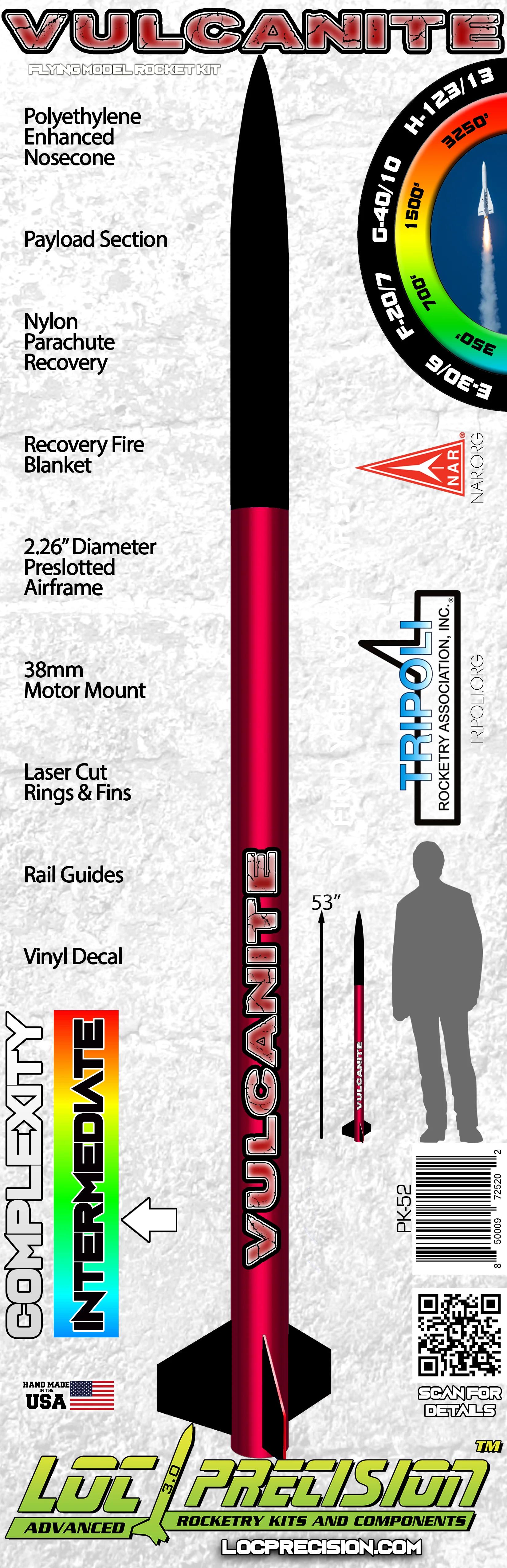 One of the ISP PERFORMANCE SERIES of kits, which feature factory pre-slotted airframe and through-the-wall fin construction and high power motor capabilities, the VULCANITE is a true high power performer. The 38mm motor mount is for Level 1 and Level 2 power if your field can handle it. This kit flies great on a variety of F and G motors using the optional MMA-2 motor mount adapter. Parachute Recovery.