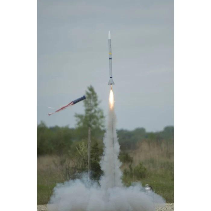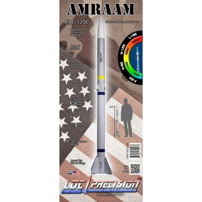 ALL Loc Precision kits include laser cut fins, rings, and slotted airframes. The AMRAAM features: 30″ Booster Section, 15" Payload, 28″ Ripstop Nylon Parachute, 38mm Motor Tube, Fire Resistant Blanket, Kevlar Shock Cord mount with nylon webbing shock cord, rail buttons and vinyl decals.