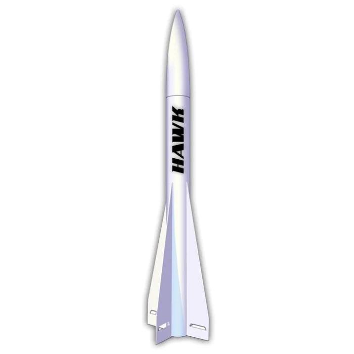 The 4" HAWK is here!! At 54" tall it is Fully loaded with LOC-N-FIN and ring system. Payload section is 11" so dual deployment is possible. It includes the 4" RNWS system which allows room in the nose cone and proper balance. 15' of nylon shock cord, 50" parachute, and rail guides. A boat tail can be added with the correct engineering. This is a LOC Custom series kit so it could be modified a number of ways for your own personal touches.